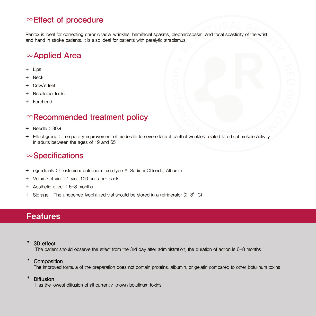Rentox is ideal for correcting chronic facial wrinkles, hemifacial spasms, blepharospasm, and focal spasticity of the wrist and hand in stroke patients.