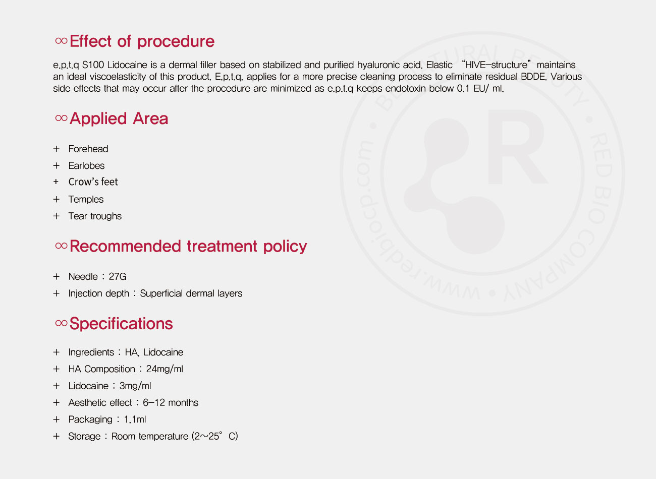 E.p.t.q S100 lidocaine is designed for the treatment of lips, cheeks and fine dermal layers such as crows feet, forehead lines, tear troughs and temporal hollows.