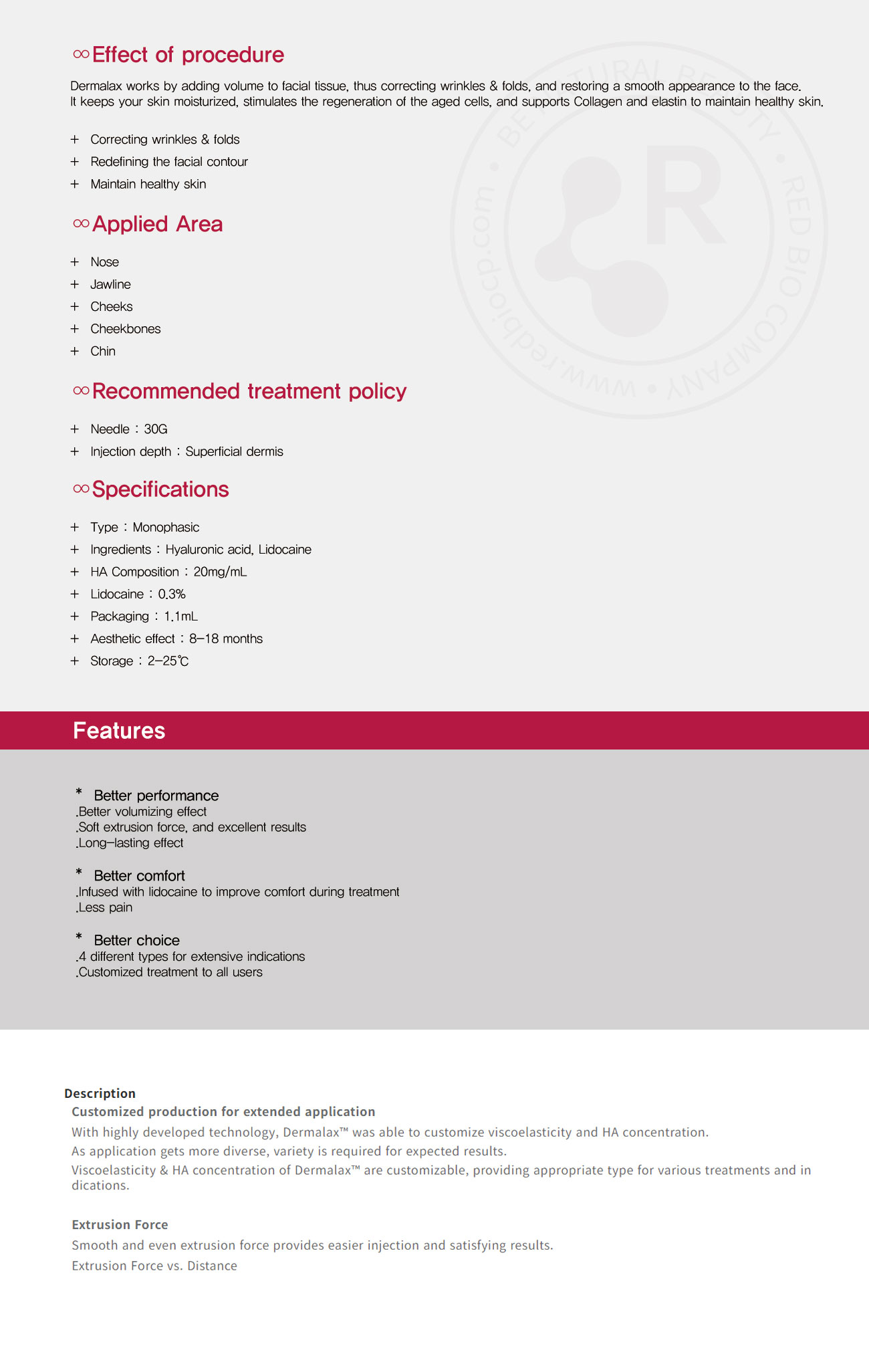 Correcting wrinkles & folds, and restoring a smooth appearance to the face. Dermalax keeps your skin moisturized, and supports Collagen and elastin to maintain healthy skin.